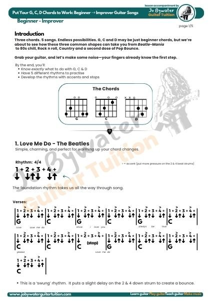 A clear, practical companion to the “5 Classic Guitar Songs with G, C & D Chords” video—designed to help you internalise the rhythms faster, play with more confidence, and actually remember how each song feels the next time you pick up your guitar.