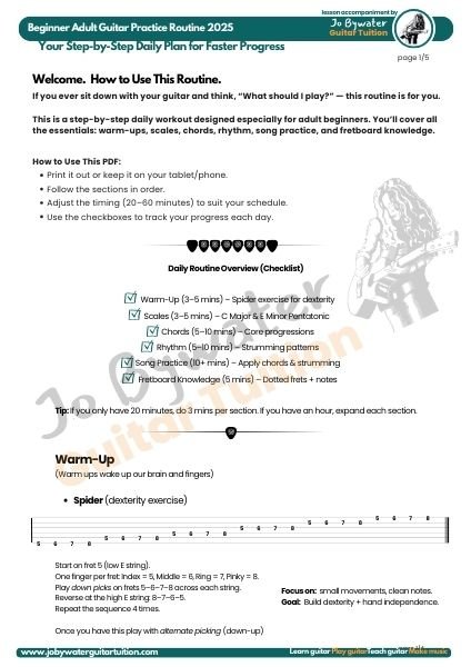 Detailed PDF to accompany video lesson of ‘Beginner Adult Guitar Routine 2025 | Step-by-Step Practice’