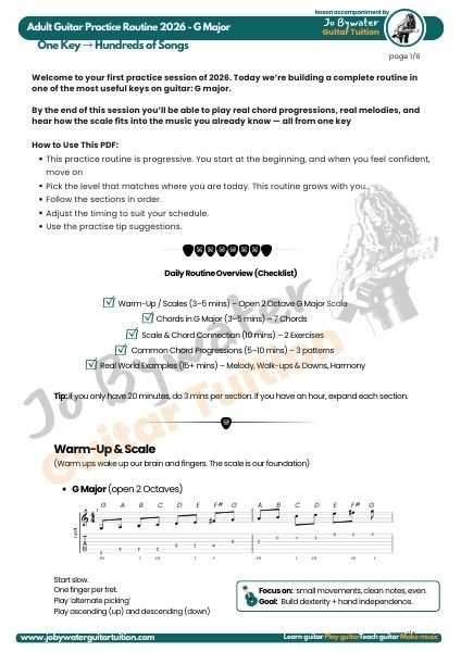 This companion PDF follows along with the G Major practice routine video, giving you a clear, printable structure to guide your daily practice.