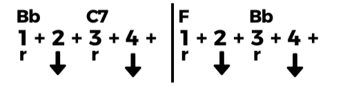 we can now develop the strumming pattern by adding the root note of each chord onto Beats 1 & 3. (Root notes = first note. Bb root is on A string fret 1, C7 root is on A string fret 3, F root note is E string fret 1).
